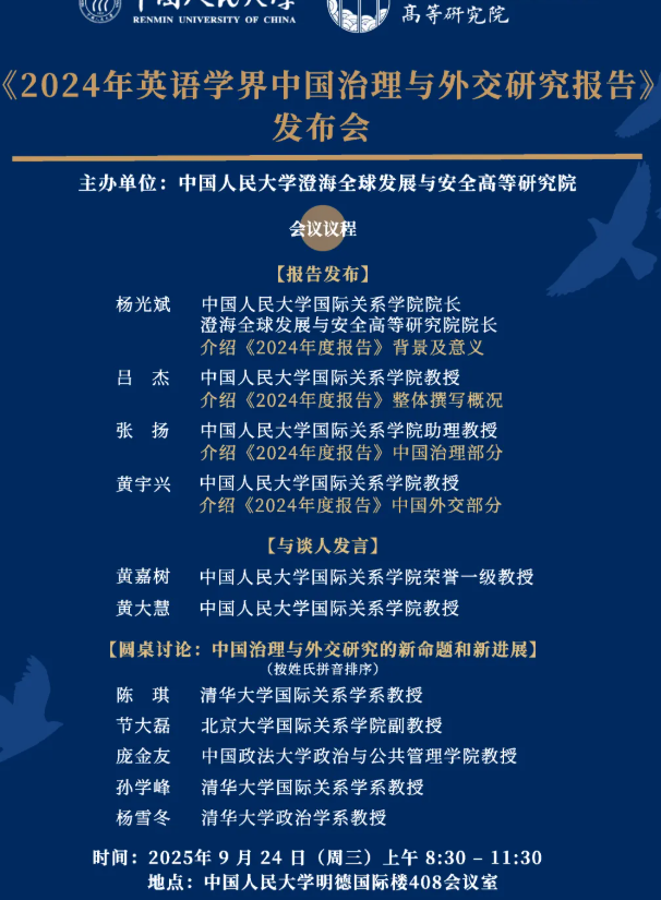 2024年9月24日,《2024年英语学界中国治理与外交研究报告》发布会在中国人民大学明德国际楼408成功举办。本次发布会由中国人民大学国际关系学院吕杰教授主持,来自北京大学、清华大学、中国政法大学和中国人民大学的相关学者进行了交流和研讨。