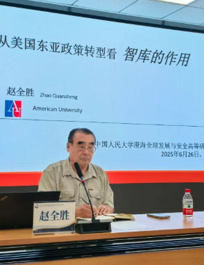 2025年6月26日,美国美利坚大学国际关系学院教授赵全胜受邀访问中国人民大学国际关系学院和澄海全球发展与安全高等研究院,为师生们带来了一场题为“从美国东亚政策转型看智库的作用”的精彩讲座。本次讲座由澄海高研院世界政治学研究中心主任、国际关系学院教授宋伟主持。中国人民大学国际关系学院教授、美国研究中心副主任刁大明,中国人民大学国际关系学院吴迪老师和连晨超老师出席参与评议。