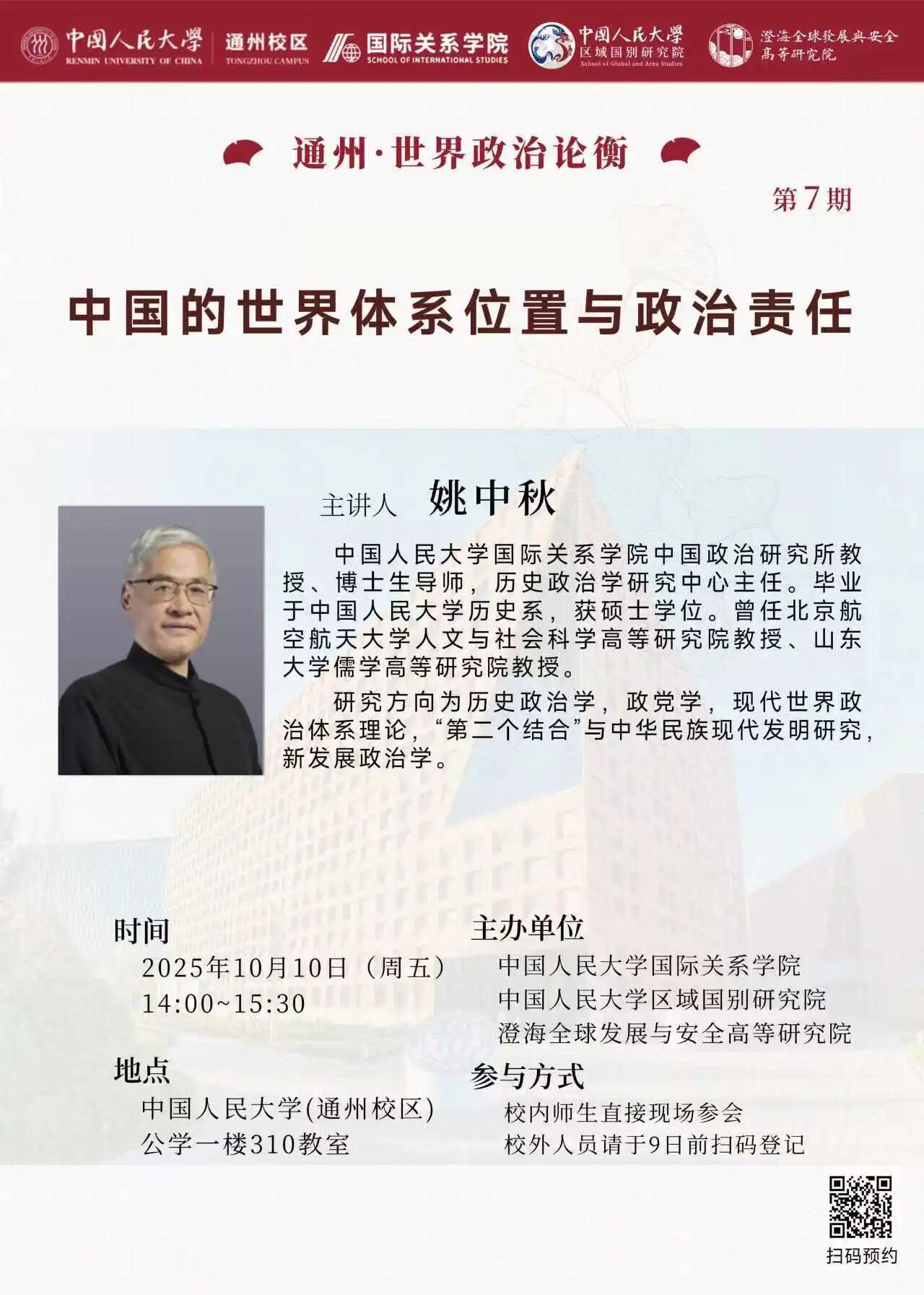 31 2025.10讲座预告 | 通州•世界政治论衡•第7期•姚中秋:中国的世界体系位置与政治责任
