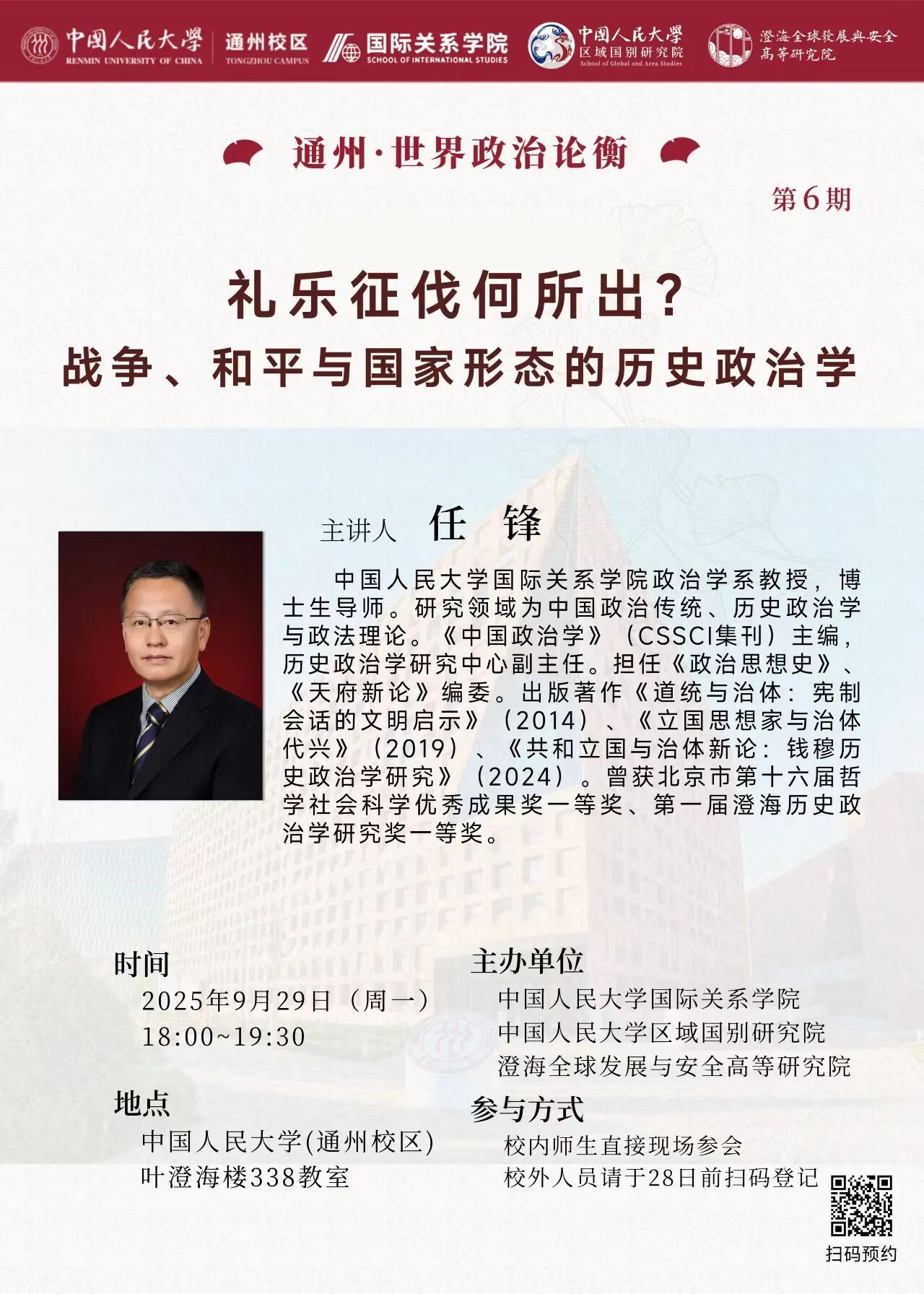 31 2025.10讲座预告 | 通州•世界政治论衡•第6期•任锋:礼乐征伐何所出?战争、和平与国家形态的历史政治学