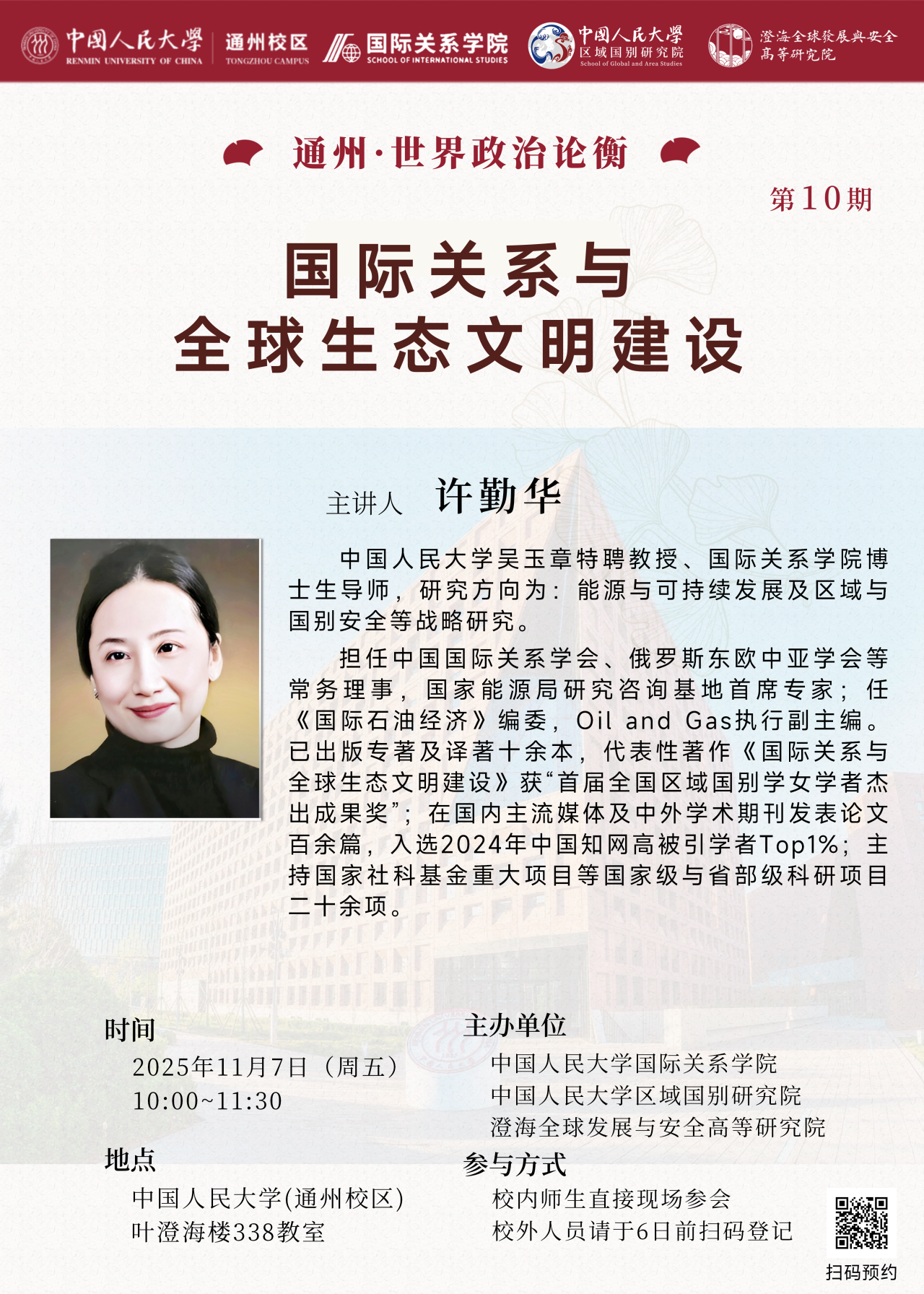 06 2025.11讲座预告 | 通州•世界政治论衡•第10期•许勤华:国际关系与全球生态文明建设