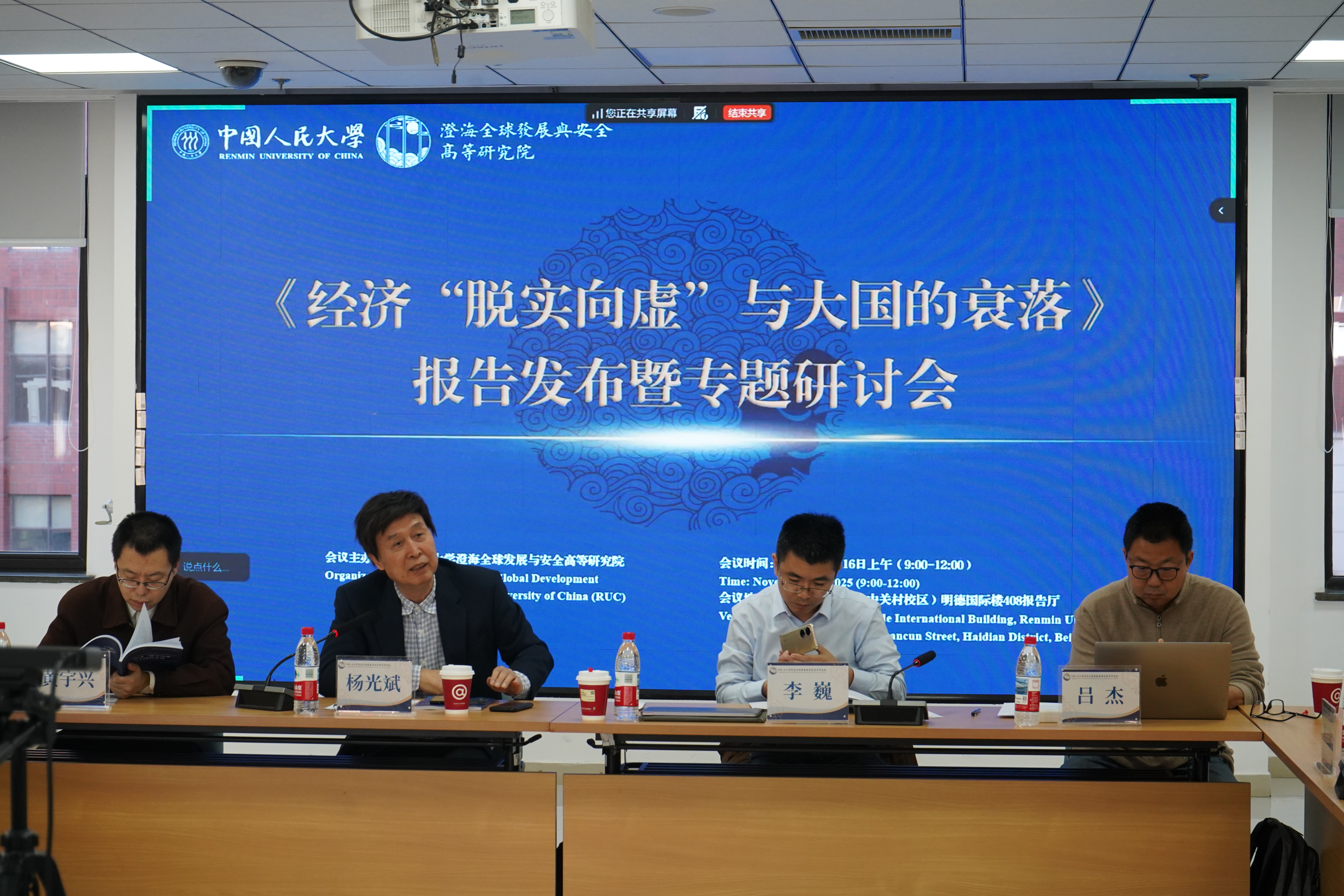 2025年11月16日,由中国人民大学澄海全球发展与安全高等研究院主办的《经济“脱实向虚”与大国的衰落》报告发布暨专题研讨会在中国人民大学明德国际楼408成功举办。来自中国社会科学院、中共中央党校、北京大学和中国人民大学的相关学者,就“国家兴衰”这一久经不衰的话题进行了交流和研讨。